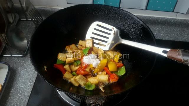 6.下入豆腐块和盐煸炒几分钟,使豆腐在煸炒时入咸味