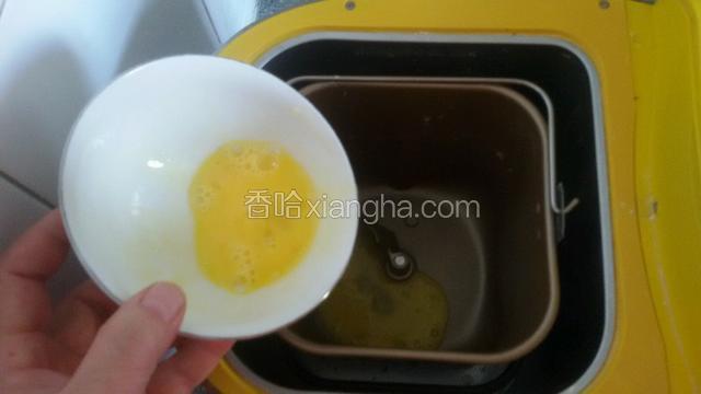 2.用半个鸡蛋液放入面包机桶里,留下半个鸡蛋液用于抹生面包坯表面上