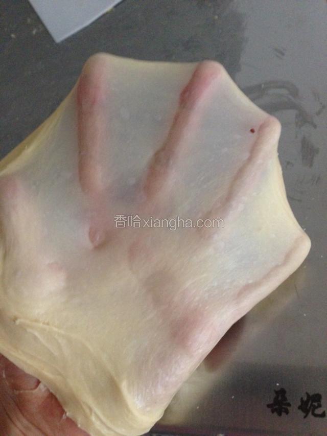 1.除黄油外所有材料混合,揉至能拉出厚膜状态。