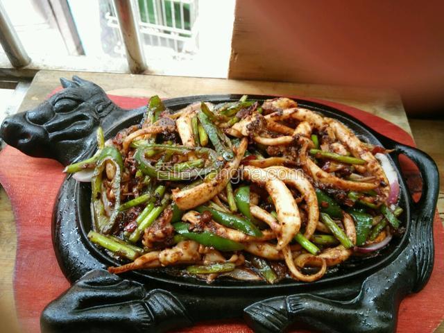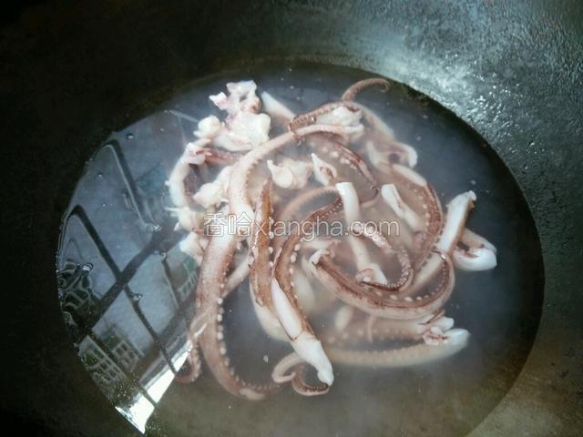 2.锅里烧开水,把鱿鱼放锅里过一下水,去一下腥味,一到两分钟即可!