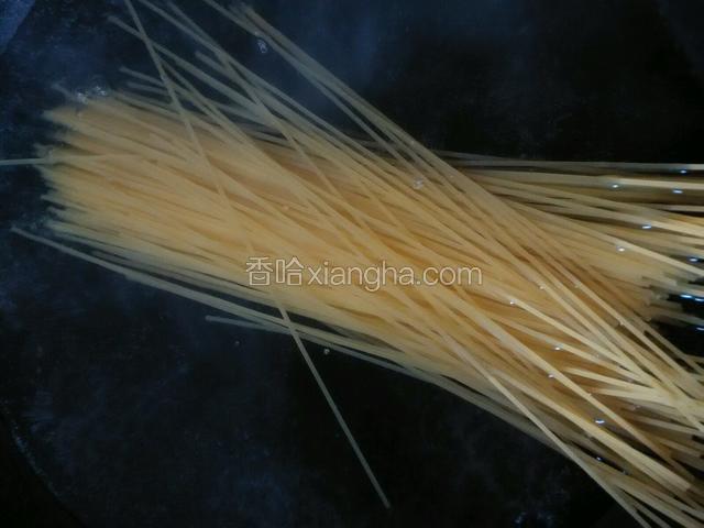 4.水开后加入另外一小匙的盐,加入意粉。水开后煮8分钟。