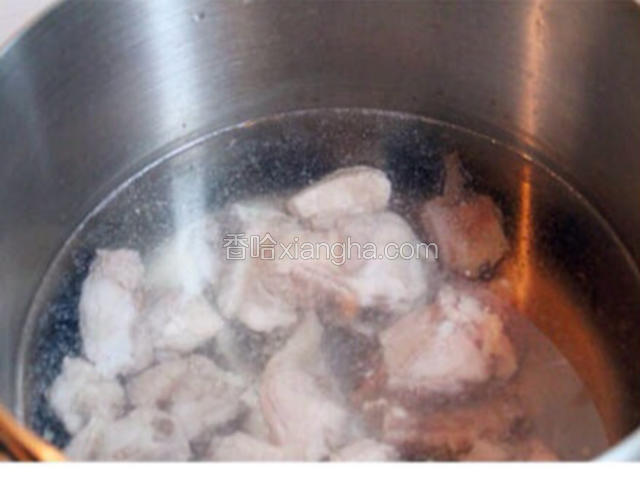 2.将焯好的排骨再次放入汤锅中,加入适量的热水,然后放入料酒、姜片、八角,盐,大火煮开