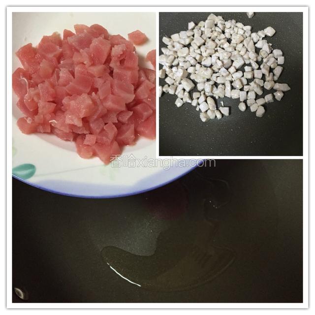 2.金枪鱼切小丁,小葱切末,姜切末,备用。