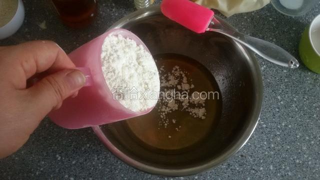 4.盆中放入温水,视水1/4勺,食用油,自制糖浆和麦芽糖浆用刮刀搅拌均匀