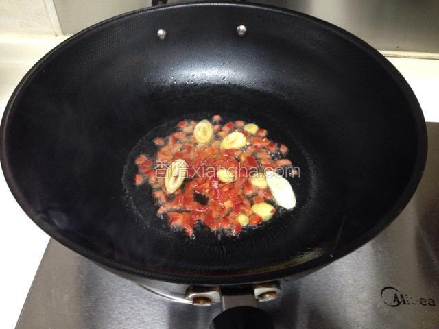 5.锅内放油烧热,将葱姜辣椒入内炒香