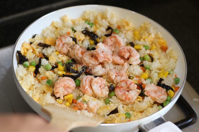 4.将虾也放入热水中焯至变色,迅速捞起。