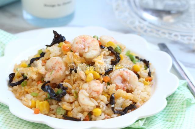 2.胡萝卜洗净切小粒,木耳泡发切丝,豌豆、玉米粒洗净备用。