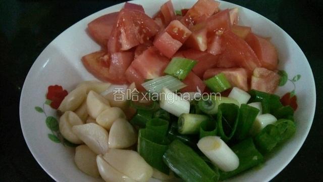 6.西红柿洗净切小块,葱切小断,蒜切片。