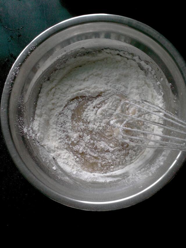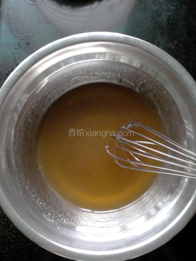 2.把枧水也放入糖浆中――油、糖浆、枧水完全搅拌均匀,融合在一起。