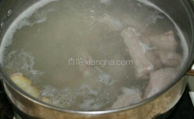 2.锅内烧开水,下排骨,撇去浮皮,捞出排骨沥干水备用