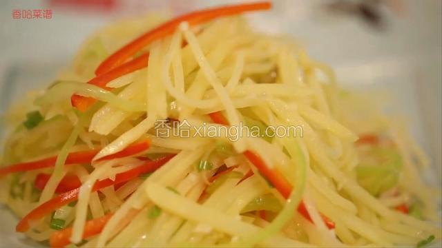 6.然后下焯好的土豆丝,大火爆炒;再放盐3克,味精3克,白醋15克,鸡粉3克,继续大火翻炒1~2分钟。