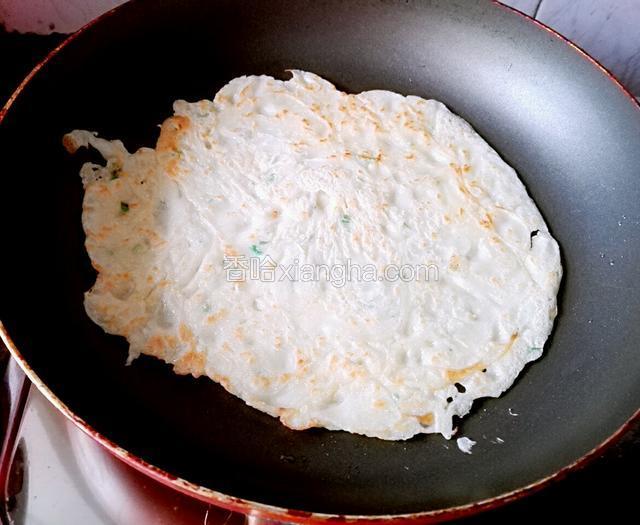 6.平底锅预热入少量花生油,油温热后倒入两勺浆糊摊平