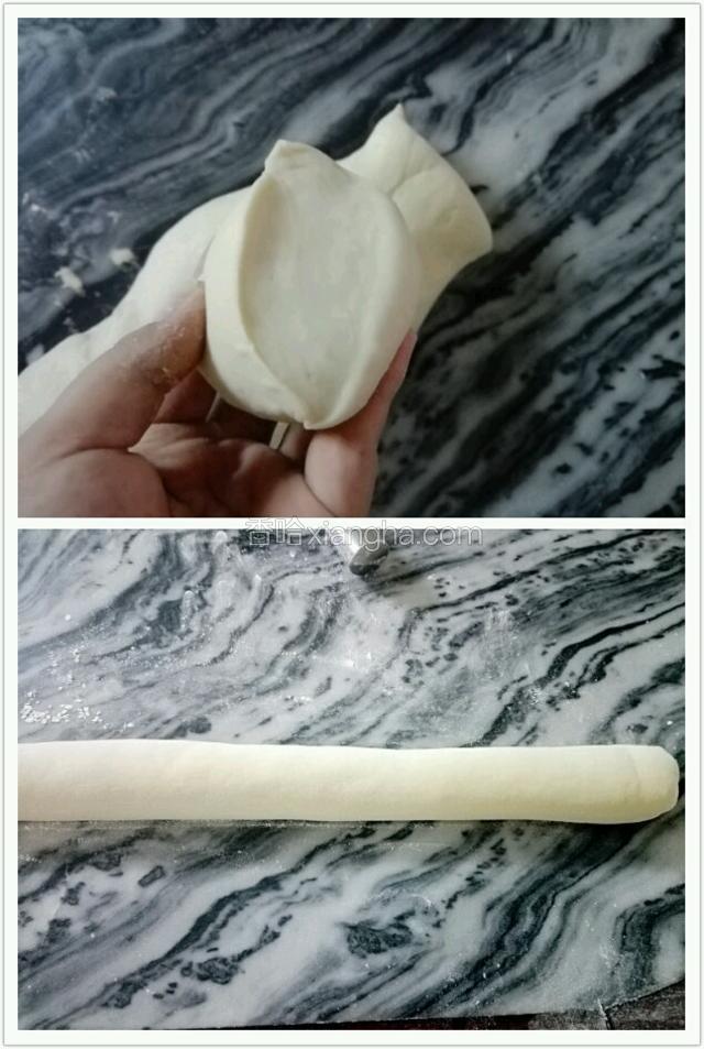 5.然后再次把面里面的汽泡完全搓出来,用刀切开没有小孔。再把面搓成长条