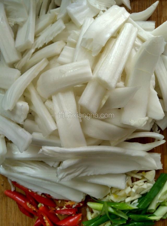 2.白菜棒切掉边上的叶子,竖切成大小均匀的长条。鲜辣椒,葱斜切成丝,蒜剁碎。