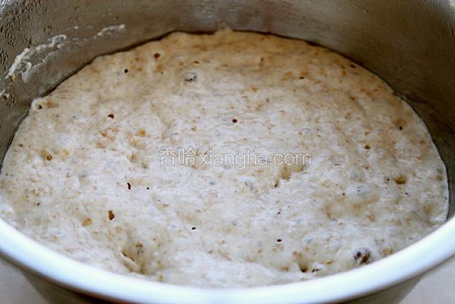 2.用筷子或者刮刀拌匀,放入冰箱低温冷藏十五个小时左右,我这个是发酵了十七个小时。(具体时间也要看发酵状态决定)