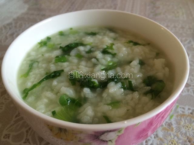 5.把切碎的生菜和葱花放在白粥里,放适量盐;