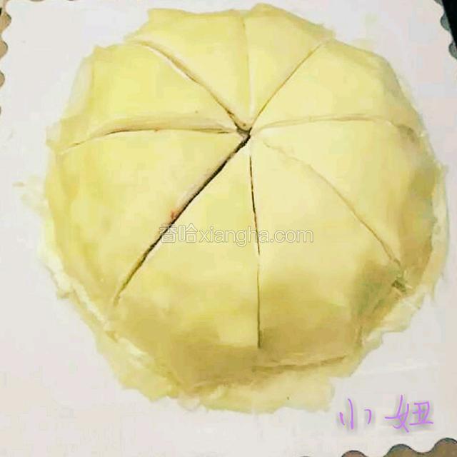 5.平底锅预热,改小火倒入一勺面粉糊,双手转动平底锅,摊均匀至面粉糊凝结,起小泡即可,取出,晾凉,