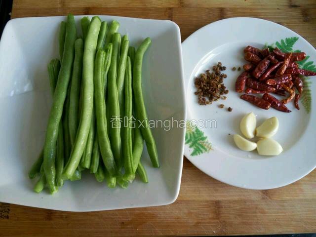 1.四季豆去两头筋洗净沥干备用,蒜米,花椒,干辣椒洗净备用