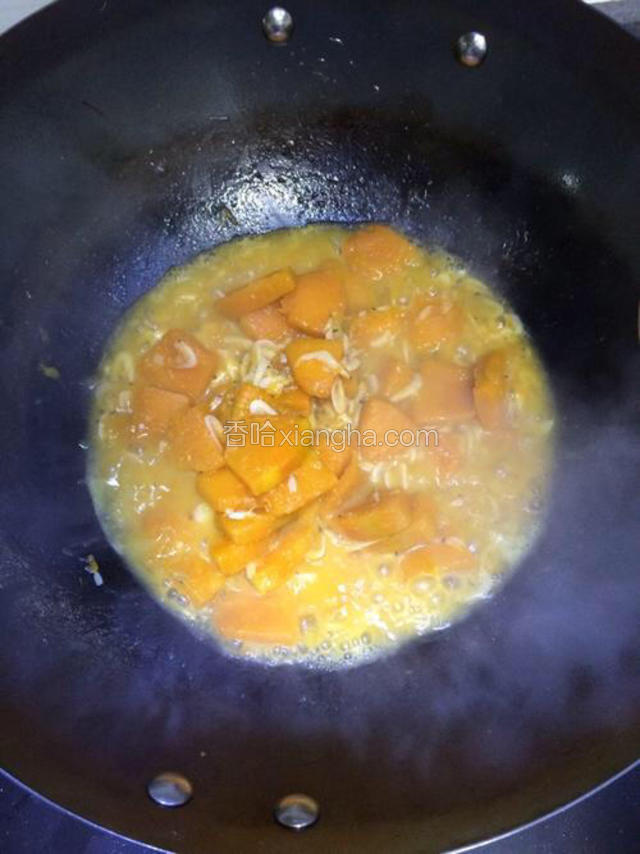 6.接着倒入南瓜炒三分钟左右,加入适量盐调味。