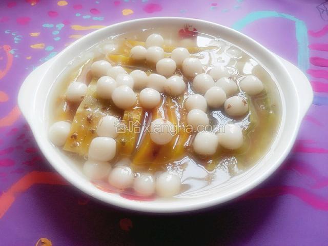 6.在汤锅里倒入适量清水,放入冰糖烧开!再把搓好的小汤圆倒入锅里烧熟(两分钟左右)!倒入之前搅拌均匀的淀粉入锅进行勾芡(顺时针搅拌)!
