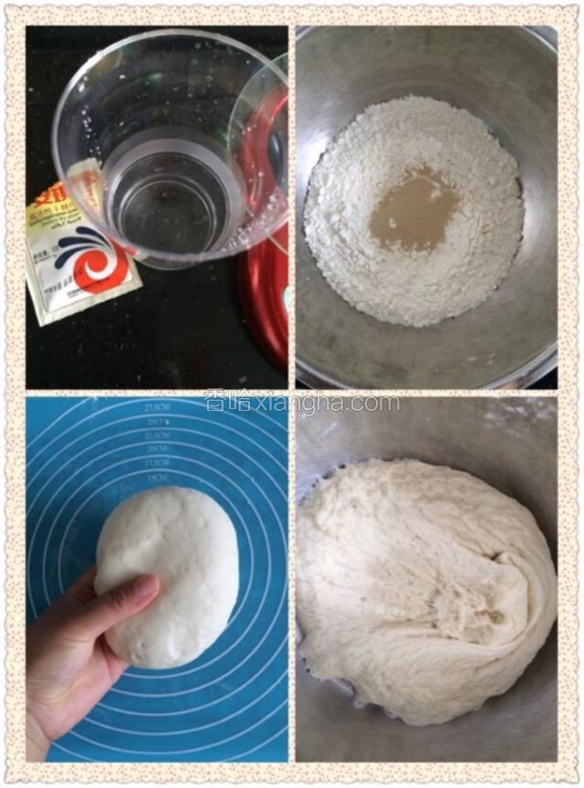2.200克面粉、4克酵母、80毫升清水和成白面团,放在温暖处进行发酵,时间为1个半小时。面团里有蜂窝状就可以了。