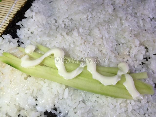 5.再铺上胡萝卜条,并在胡萝卜条上同样挤上沙拉酱。
