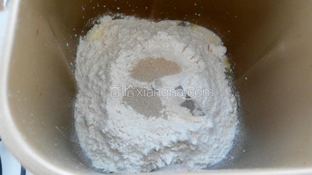 2.盐和糖对角放,然后放入面粉,酵母放最上面,启动面包机揉面程序。