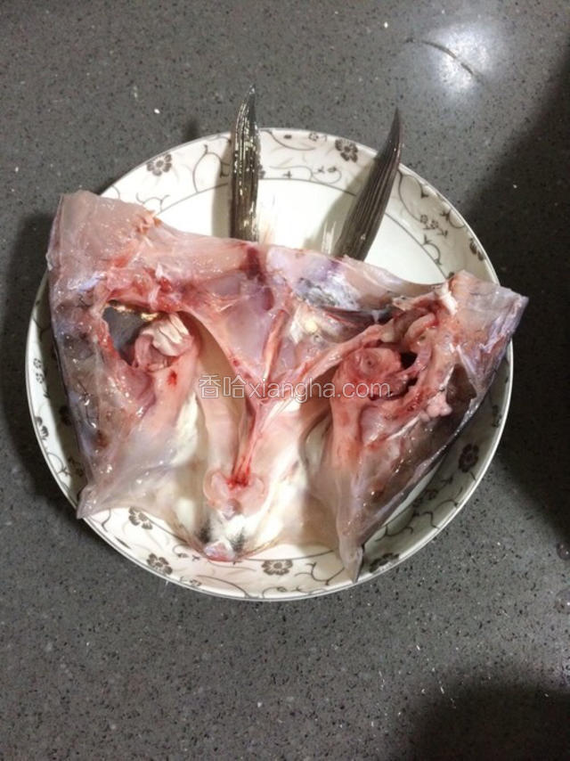 2.剖开后的鱼头清洗干净,去除鱼鳃,还有里面的黑膜。沥干水分备用。