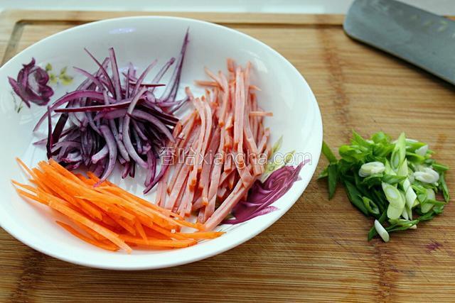 2.胡萝卜、洋葱和火腿切丝,小葱切葱花。(喜欢吃辣可以切些辣椒丝)
