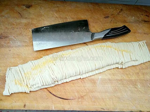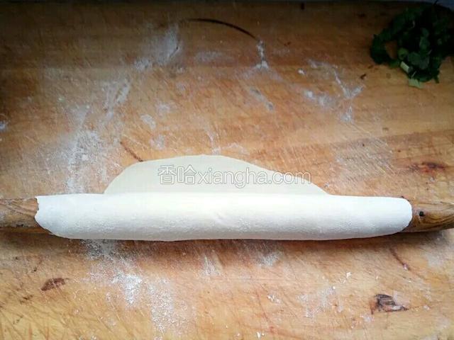 4.然后放少许玉米面当面铺,折叠成10厘米宽