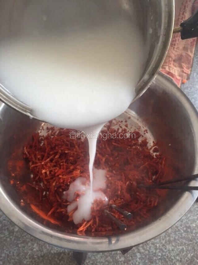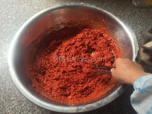 6.将300克辣椒粉,萝卜丝,姜,蒜,苹果,梨沫一起倒入盆中拌匀