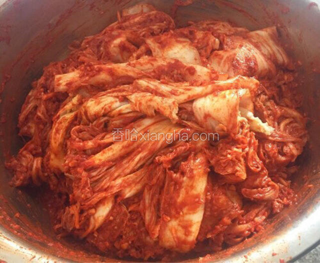 2.可能是品种问题,家里白菜芯比较紧都粘上了,不像北方白菜一片一片的,所以抹盐不好抹,后面干脆掰断了一片一片抹。四颗白菜用了半包盐,韩式泡菜不像川泡菜盐不需要那么多,因为后面还得过水,当然口味重的多放点也可以。都抹好用保鲜膜封上,盆上加重物压制,我是压上一大盆水。腌制十几小时。下午弄好,第二天上午就可以了。