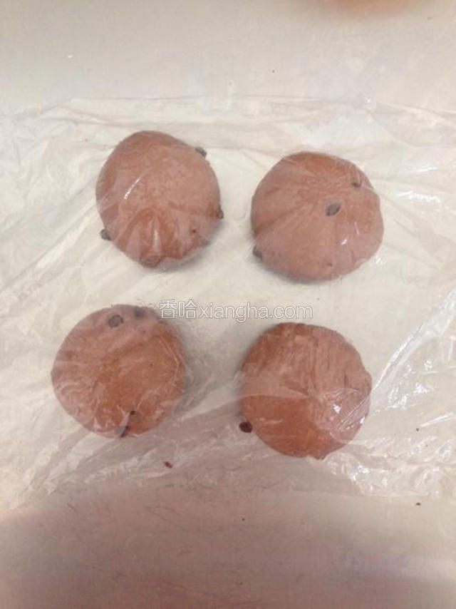 2.加入巧克力豆,揉匀。滚圆后放在温暖的地方发酵至2.5倍大。