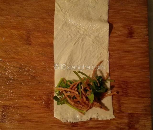 5.将调好的香菜和馓子卷入腐衣中。