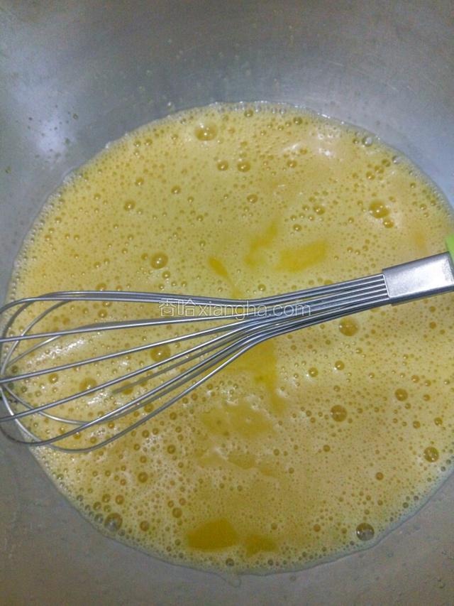 3.鸡蛋打入无水无油盆中,加入剩余45克白糖。