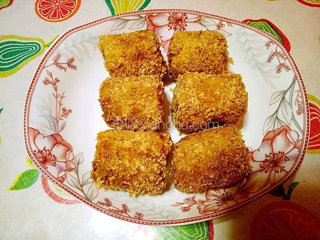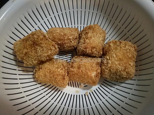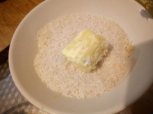 5.取一段香蕉先在淀粉里滚一圈,使两端和表层都沾上一层干淀粉
