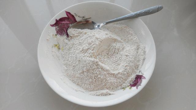 6.把全麦面粉,玉米淀粉,奶粉,小苏打和泡打粉混合均匀。