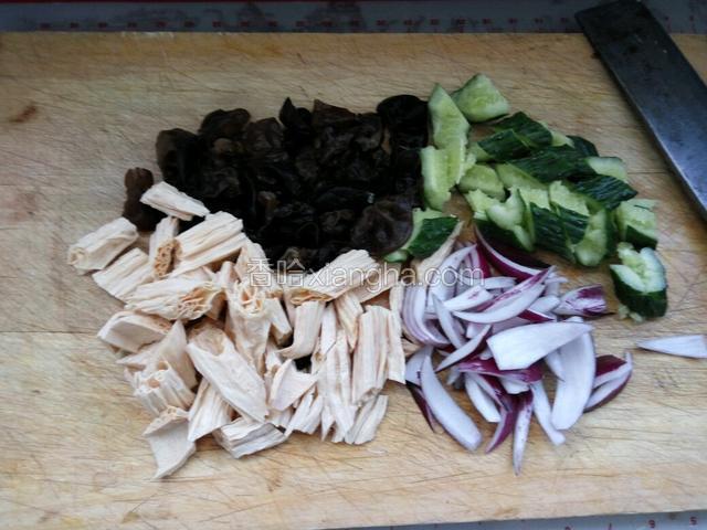 1.腐竹和木耳提前泡发洗净备用,黄瓜拍碎,洋葱切丝