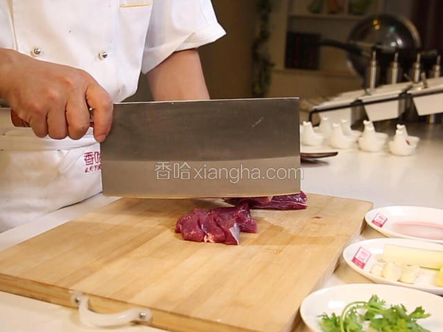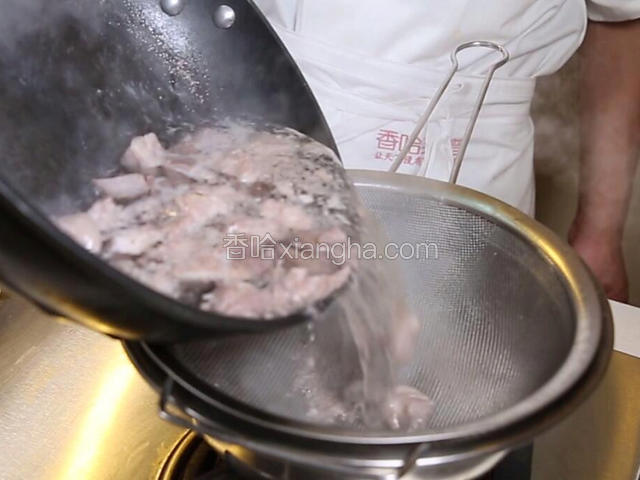 2.锅中放一锅冷水,将羊肉块倒入,大火烧开,羊肉用漏勺捞出备用。
