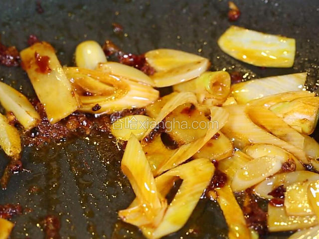 5.锅中下油15克,大火至油热七成,放入豆瓣酱,花椒,葱,姜,蒜,爆香后下料酒,蚝油。