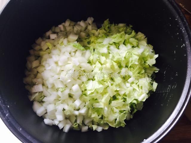 1.白菜洗净切成粒,放盐腌制,直到大量出水。
