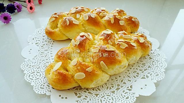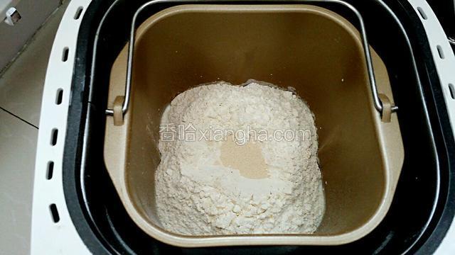 1.把面团所用材料除黄油外放进面包桶内,盐和糖要对角放,酵母放在最上面,启动面包机开始揉面。