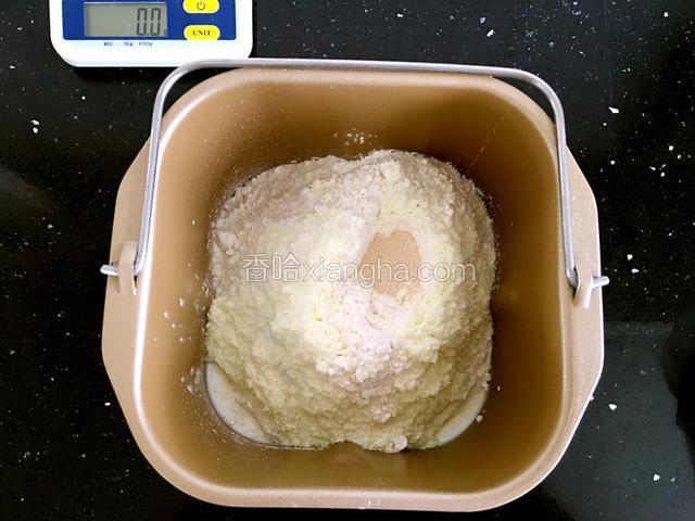 2.最后放入高粉和奶粉,再把酵母埋入面粉中。