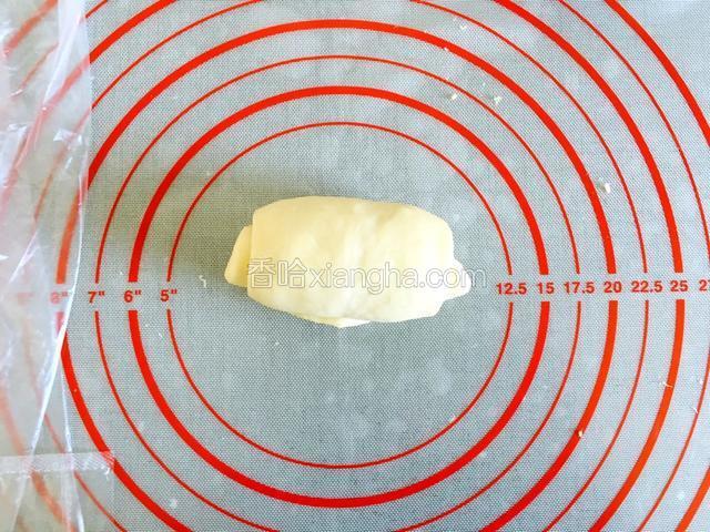 5.面团取出,用擀面杖为面团排出内部气体,滚圆。分割成12个均等的小面团,盖保鲜膜松弛15分钟。