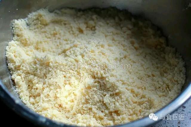 1.黄油软化后倒入低筋面粉和白砂糖,用手揉搓均匀,至粗玉米粉状。