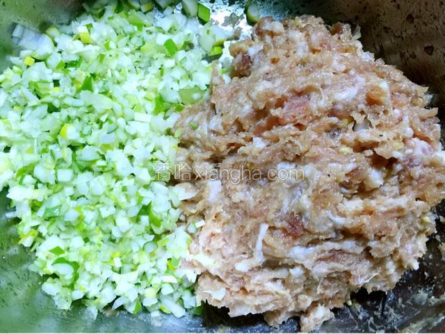 1.把所有调料(葱末除外)与肉馅混合,一个方向搅打上劲至肉馅粘稠。