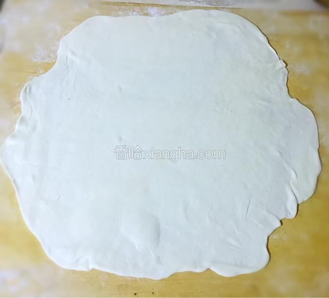 5.面板涂抹少许色拉油,将面团擀成均匀的厚度,尽量擀圆。