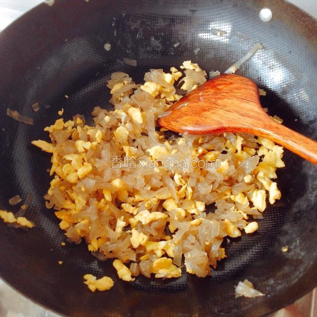 6.鸡蛋打散,滴几滴料酒,倒入锅中炒熟,用锅铲铲碎