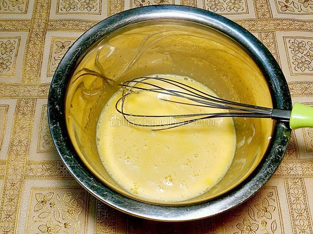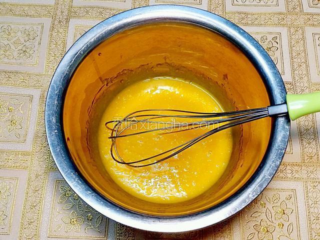 2.蛋黃加糖拌勻,再加油拌至乳化