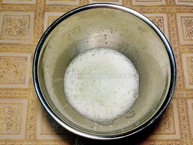 5.蛋白加檸檬汁打至粗泡,第一次加入1/3的糖
